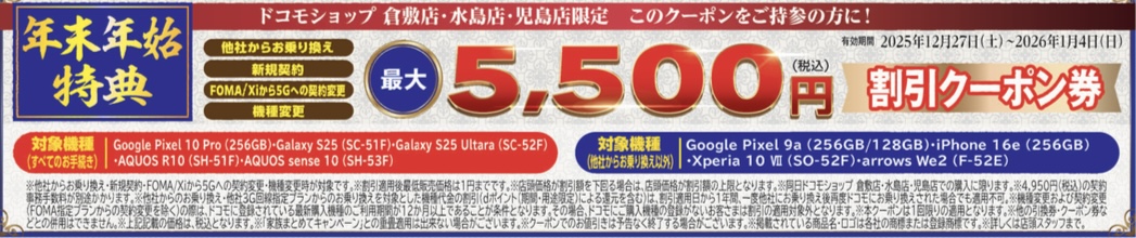 ドコモショップ倉敷店・水島店・児島店【1月2~4日限定】2026年初売りスタート! 新春特典 お年玉価格&クーポン券